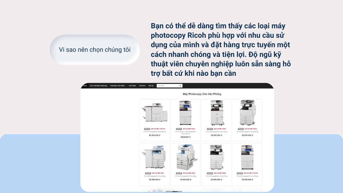 Nếu bạn đang tìm kiếm một địa chỉ tin cậy để thuê máy photocopy Ricoh, website photocopyricoh.vn là sự lựa chọn hoàn hảo cho bạn. Tại đây, bạn có thể dễ dàng tìm thấy các loại máy photocopy Ricoh phù hợp với nhu cầu sử dụng của mình và đặt hàng trực tuyến một cách nhanh chóng và tiện lợi.