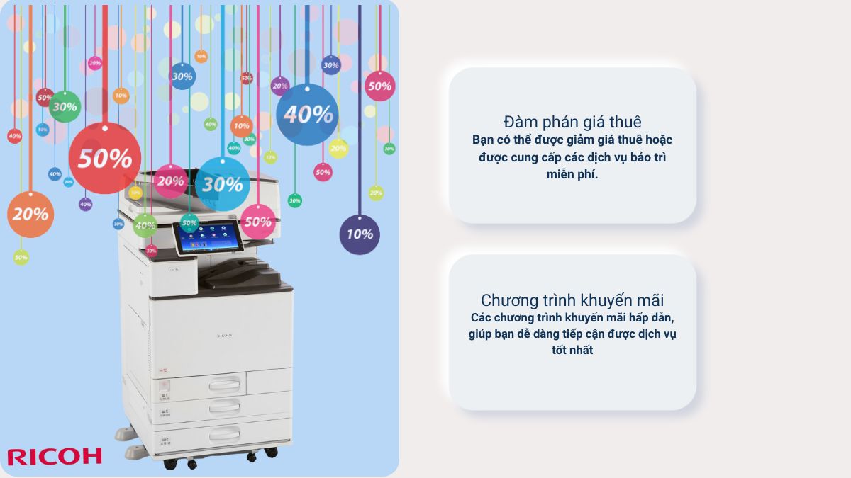 Sau khi đặt máy photocopy Ricoh, bạn có thể đàm phán với công ty để giảm giá thuê máy. Nếu bạn thuê máy photocopy Ricoh trong thời gian dài, bạn có thể được giảm giá thuê hoặc được cung cấp các dịch vụ bảo trì miễn phí.