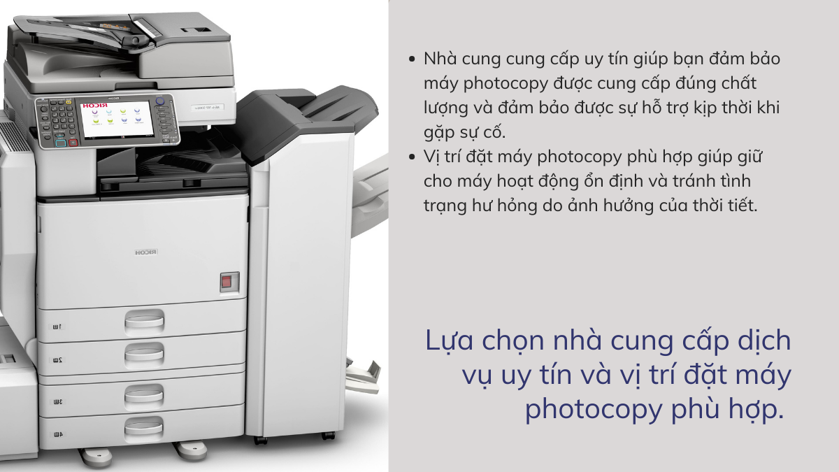 Khi thuê máy photocopy, việc lựa chọn một nhà cung cấp uy tín và đáng tin cậy là vô cùng quan trọng. Bạn nên tìm hiểu kỹ về nhà cung cấp và đọc kỹ các điều khoản trong hợp đồng trước khi ký kết. Điều này giúp bạn đảm bảo máy photocopy được cung cấp đúng chất lượng và đảm bảo được sự hỗ trợ kịp thời từ nhà cung cấp khi gặp sự cố.