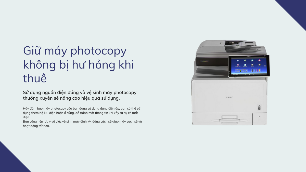 Máy photocopy là một trong những công cụ quan trọng trong văn phòng hiện đại, giúp chúng ta sao chụp và in ấn tài liệu một cách dễ dàng và nhanh chóng. Tuy nhiên, nếu không được sử dụng đúng cách hoặc bảo trì đúng cách, máy photocopy có thể dễ dàng bị hư hỏng và gây ra nhiều khó khăn trong quá trình làm việc. Đối với những người thuê máy photocopy, việc giữ cho máy không bị hư hỏng là một yếu tố quan trọng để tiết kiệm chi phí và đảm bảo công việc diễn ra thuận lợi. Sau đây là những lời khuyên hữu ích để giúp bạn giữ cho máy photocopy không bị hư hỏng khi thuê.