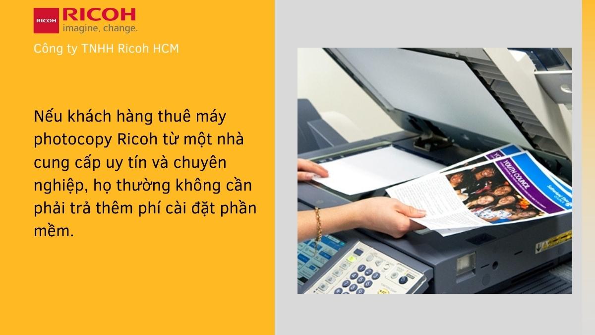 Tuy nhiên, nếu khách hàng thuê máy photocopy Ricoh từ một nhà cung cấp uy tín và chuyên nghiệp, họ sẽ thường không cần phải trả thêm phí cài đặt phần mềm. Các nhà cung cấp như vậy đã tính toán chi phí cài đặt phần mềm vào giá thuê của máy photocopy. Do đó, khách hàng chỉ cần trả một khoản phí duy nhất để sử dụng máy photocopy Ricoh, bao gồm cả việc cài đặt phần mềm. Điều này sẽ giúp khách hàng tiết kiệm chi phí và tránh những rắc rối không đáng có trong quá trình sử dụng máy photocopy.
