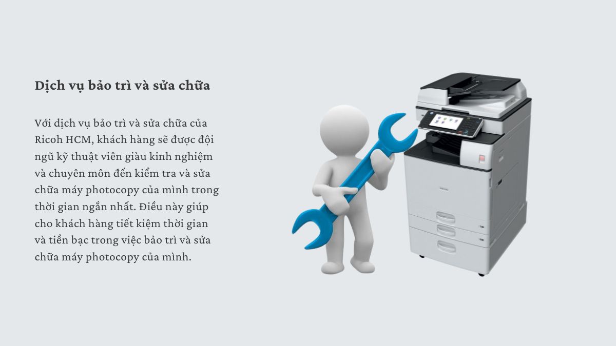 Máy photocopy là một thiết bị công nghệ cao và cần được bảo trì và sửa chữa thường xuyên để đảm bảo hoạt động ổn định và tránh những sự cố không đáng có. Với dịch vụ bảo trì và sửa chữa của Ricoh HCM, khách hàng sẽ được đội ngũ kỹ thuật viên giàu kinh nghiệm và chuyên môn đến kiểm tra và sửa chữa máy photocopy của mình trong thời gian ngắn nhất. Điều này giúp cho khách hàng tiết kiệm thời gian và tiền bạc trong việc bảo trì và sửa chữa máy photocopy của mình.