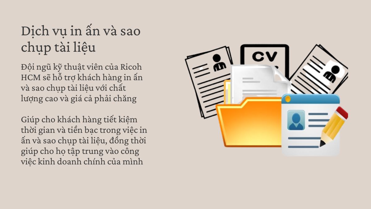 Ngoài việc cung cấp máy photocopy, Ricoh HCM còn cung cấp dịch vụ in ấn và sao chụp tài liệu cho khách hàng của mình. Đội ngũ kỹ thuật viên của Ricoh HCM sẽ hỗ trợ khách hàng in ấn và sao chụp tài liệu với chất lượng cao và giá cả phải chăng. Điều này giúp cho khách hàng tiết kiệm thời gian và tiền bạc trong việc in ấn và sao chụp tài liệu, đồng thời giúp cho họ tập trung vào công việc kinh doanh chính của mình.