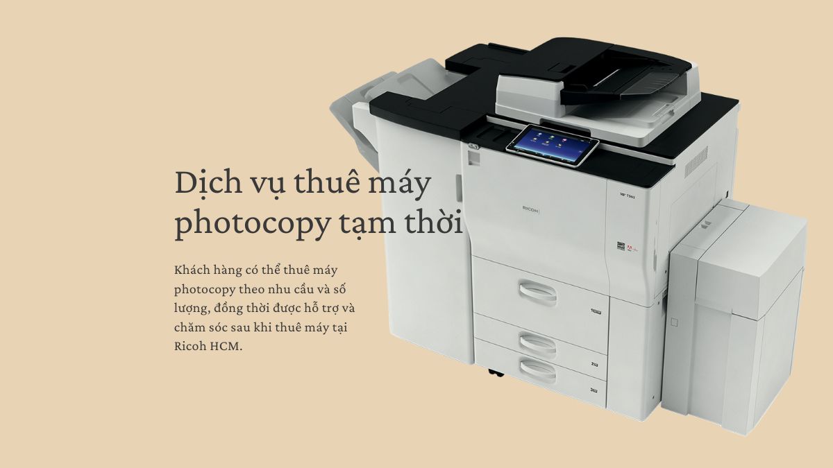 Nếu khách hàng cần sử dụng máy photocopy tạm thời trong một thời gian ngắn, Ricoh HCM cung cấp dịch vụ thuê máy photocopy tạm thời. Khách hàng có thể thuê máy photocopy theo nhu cầu và số lượng, đồng thời được hỗ trợ và chăm sóc sau khi thuê máy tại Ricoh HCM.