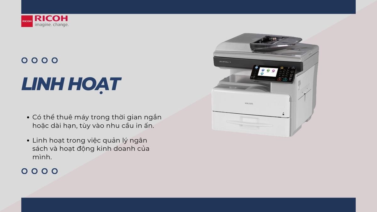 Thuê máy photocopy Ricoh mini cũng giúp tăng tính linh hoạt trong việc in ấn. Các doanh nghiệp và cá nhân có thể thuê máy photocopy Ricoh mini trong thời gian ngắn hoặc dài hạn, tùy vào nhu cầu in ấn của họ. Điều này cho phép các doanh nghiệp và cá nhân linh hoạt trong việc quản lý ngân sách và hoạt động kinh doanh của mình.