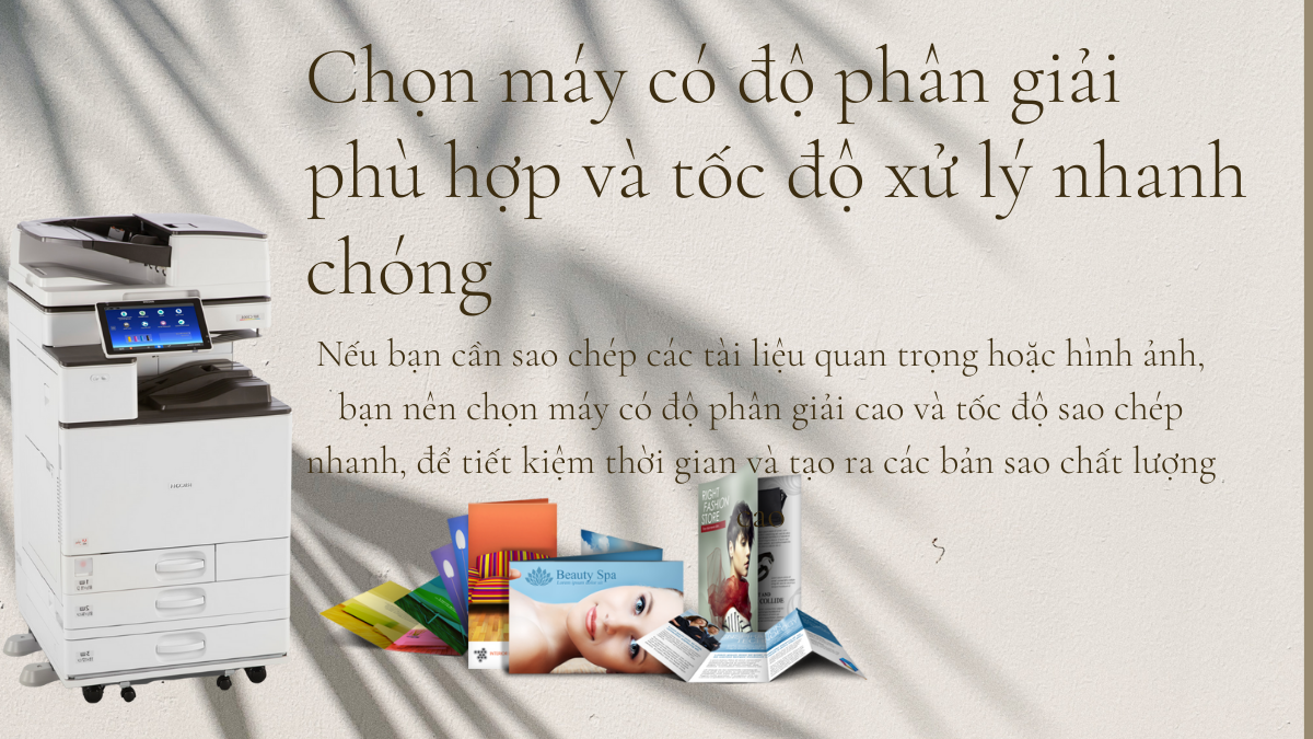 Tốc độ sao chép của máy photocopy Ricoh cũng là yếu tố quan trọng khi chọn máy. Nếu bạn cần sao chép một lượng lớn các tài liệu mỗi ngày, bạn nên chọn máy có tốc độ sao chép cao để tiết kiệm thời gian.