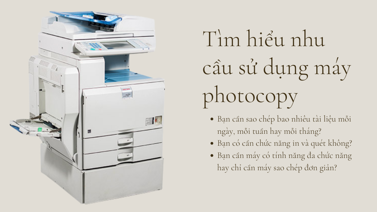 Trước khi chọn máy photocopy Ricoh, bạn nên xác định rõ nhu cầu sử dụng của mình. Bạn cần sao chép bao nhiêu tài liệu mỗi ngày, mỗi tuần hay mỗi tháng? Bạn có cần chức năng in và quét không? Bạn cần máy có tính năng đa chức năng hay chỉ cần máy sao chép đơn giản? Điều này sẽ giúp bạn tìm ra được máy photocopy Ricoh phù hợp với nhu cầu của mình.