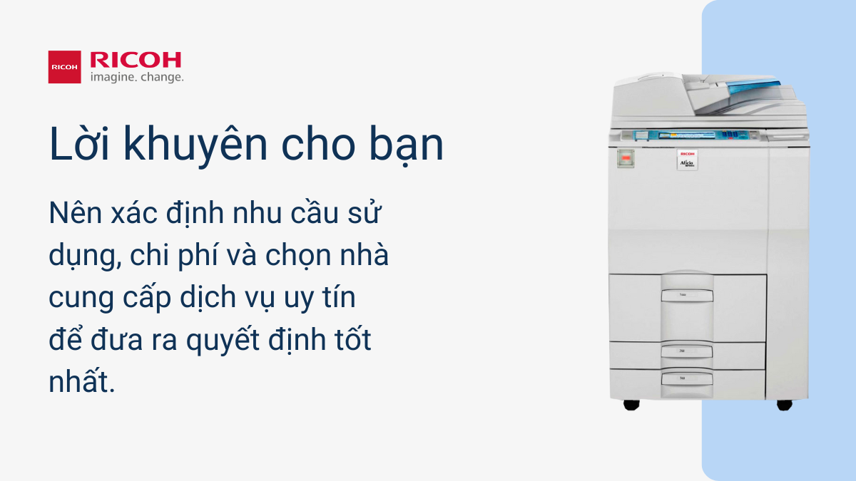 Khi quyết định mua máy photocopy Ricoh MP7001, bạn cần đánh giá kỹ các tính năng của sản phẩm, xác định nhu cầu sử dụng, tính toán chi phí và chọn nhà cung cấp uy tín. Bên cạnh đó, bạn cũng cần lựa chọn dịch vụ hậu mãi tốt để đảm bảo sản phẩm luôn hoạt động tốt và đáp ứng được nhu cầu sử dụng của doanh nghiệp.